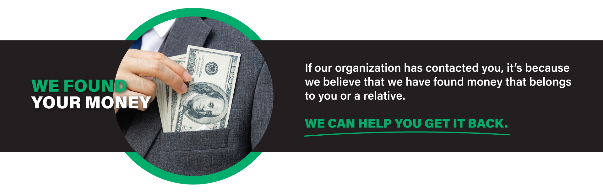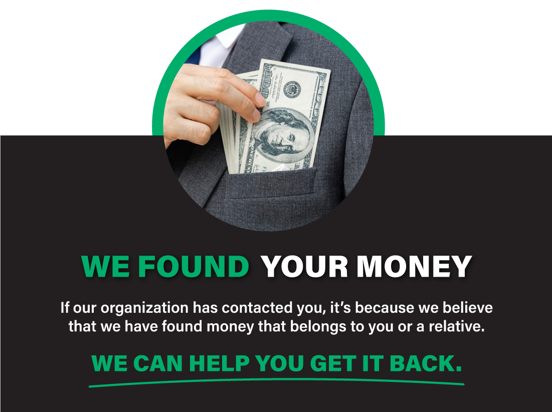 If you've received a letter, postcard, or telephone call from our organization, it's because we've located funds we believe belong to you.